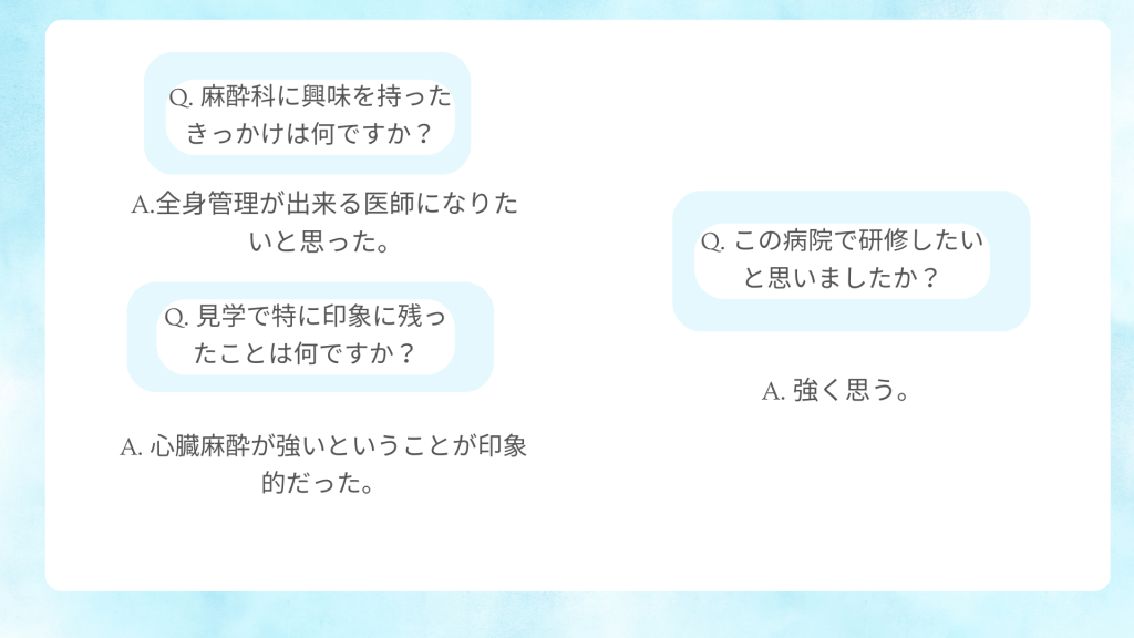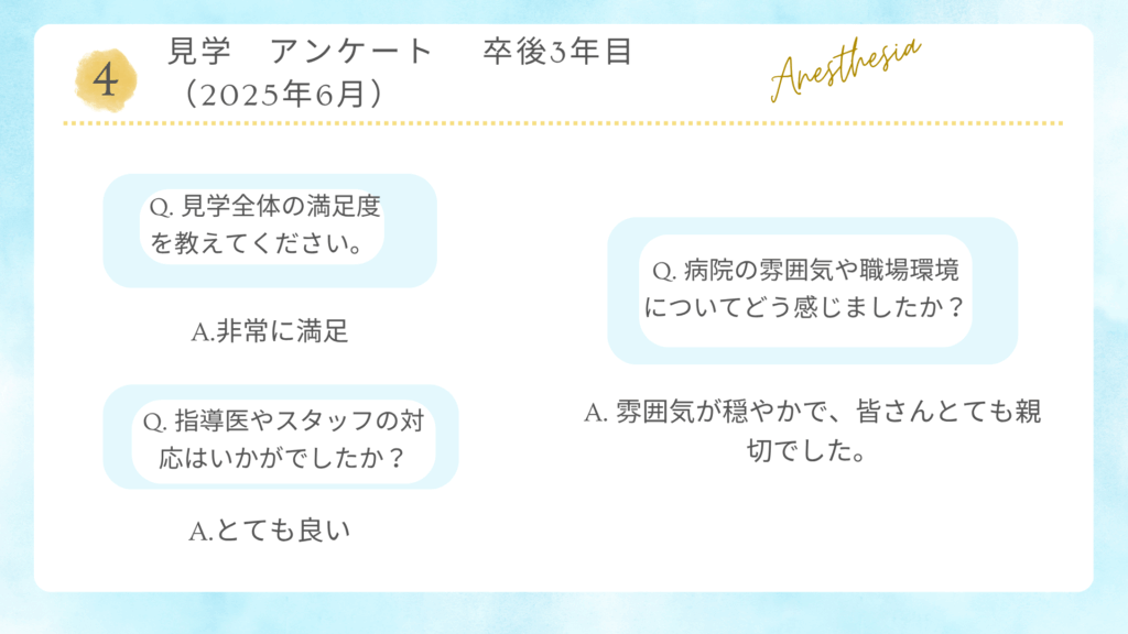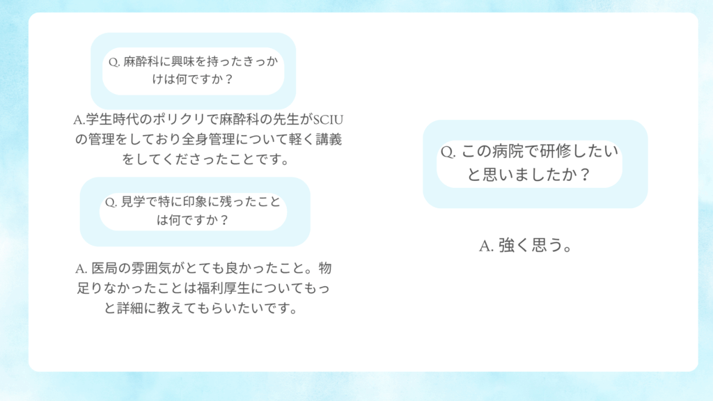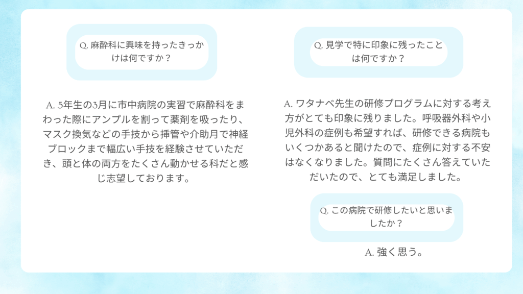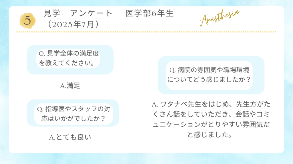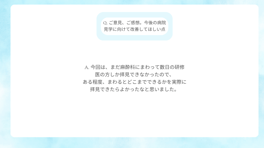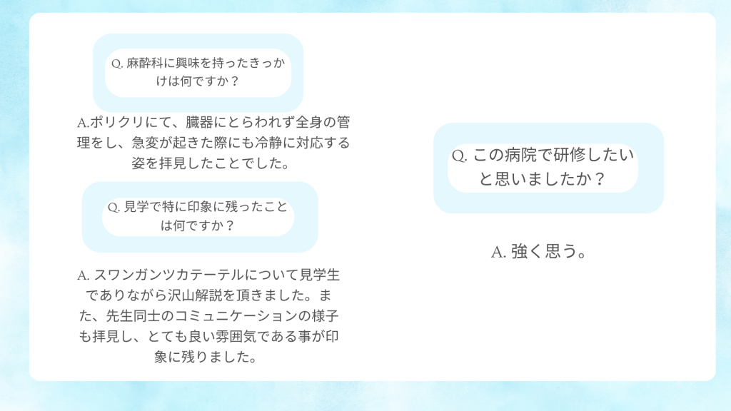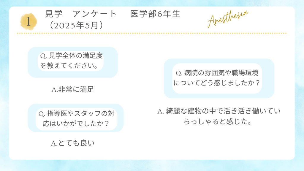病院見学会 アンケート(新着順に掲載) 2025年7月 医学部6年生 お一人に来て頂きました。 2025年6月 初期研修医2年目と卒後3年目の先生方お2人に来て頂きました。 2025年5月 医学部生 お2人に来て頂きました。